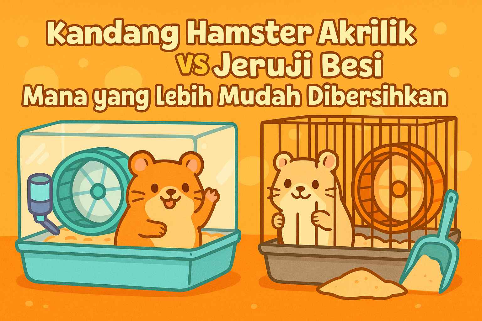 Kandang akrilik lebih mudah dilap tapi lebih sulit disanitasi sempurna. Kandang jeruji lebih cepat kering tapi membutuhkan perawatan rutin tiap batang. Jawabannya bergantung pada jenis hamster, kondisi rumah, dan kesabaran Anda.