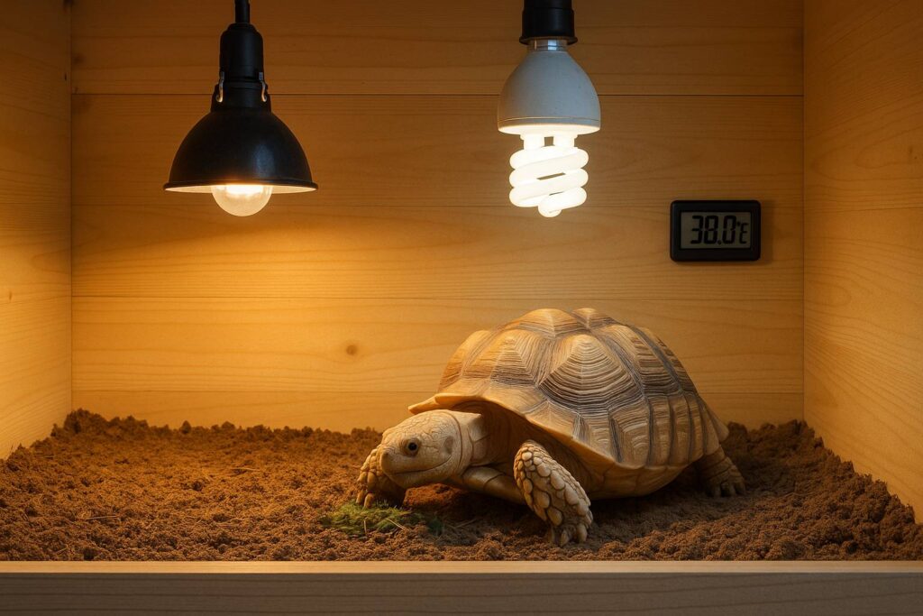 Sulcata butuh suhu basking 35-40°C dan UVB 10-12 jam sehari. Kalau kamu pelihara indoor, ini adalah pos penguras kantong nomor dua.